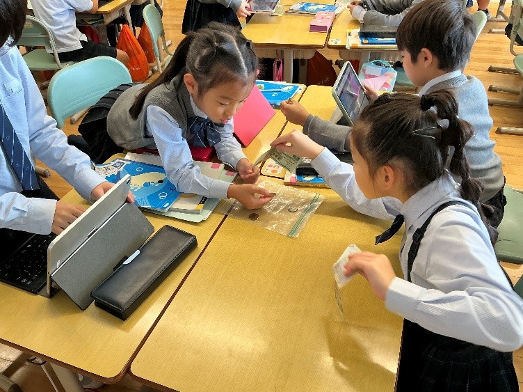 Working in groups, students carefully observed bills and coins from different countries and compared them to Japanese yen.