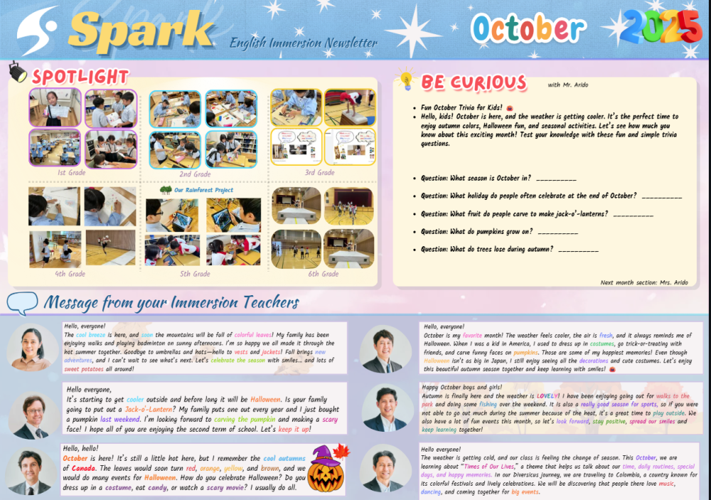 Hello everyone, The Spark Immersion newsletter for October is here! Please take a look and see what is going on in our Immersion classes. If you have time, please try to answer the trivia questions, too!