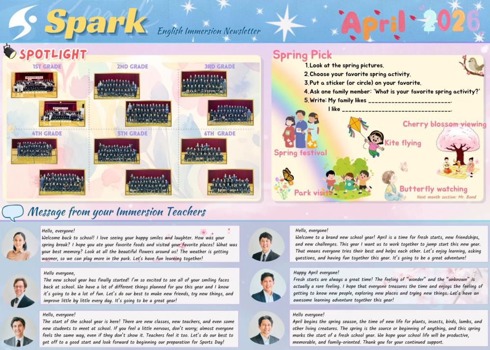We are pleased to send you the first edition of the 2026-2027 Spark Immersion Newsletter!​ We will use this newsletter to give you some highlights of what each grade level has done in the previous month. It is our hope that you can spend a little bit of time reading over it with your family each month. Please also take a look at the messages from the Immersion teachers and get some insight into their perspectives as well. ​ ​ Enjoy!​