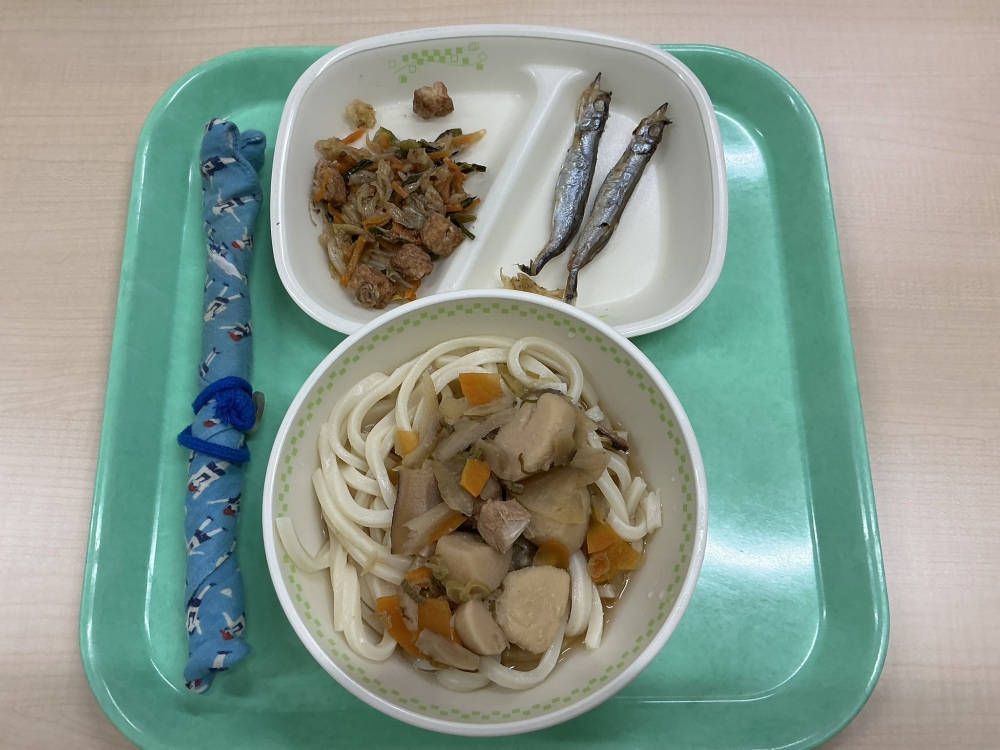 今日の給食のしっぽくうどんには、しいたけや里芋、にんじん、大根、ごぼう、など、たくさんの具材が入っていました。