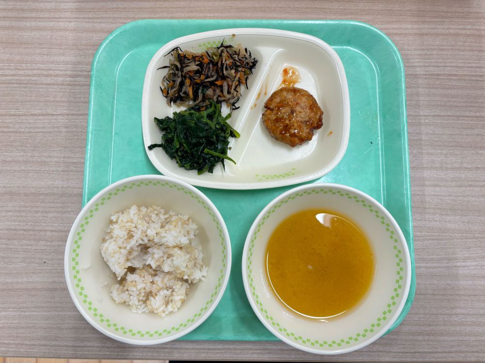 本日の給食は、素材の味を大切にした「自然派バーグ」を主菜に、体にやさしい和食を組み合わせました。