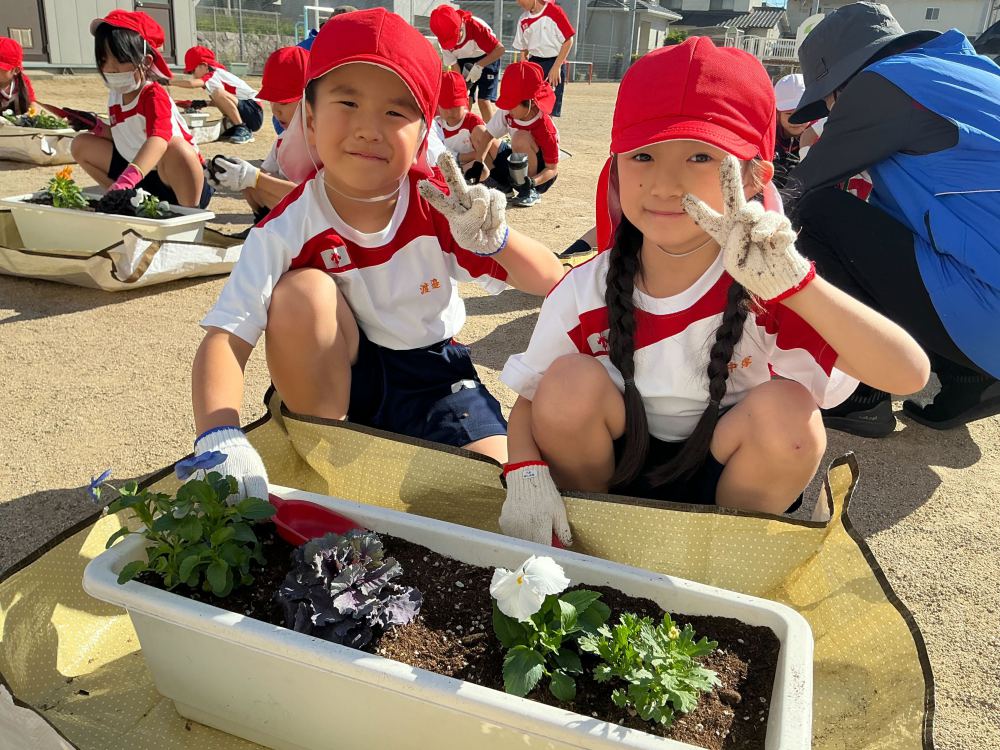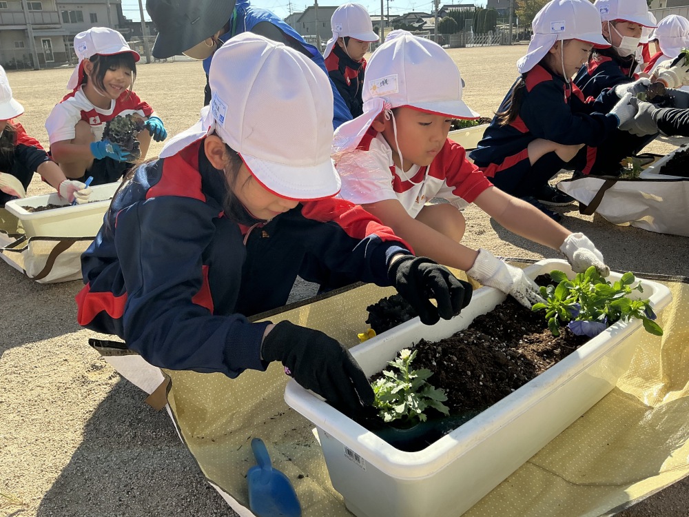 子供たちは「春の花いっぱい運動」での経験をよく覚えていて、土の掘り方や苗の置き方を思い出しながら、ていねいに作業を進めていました。