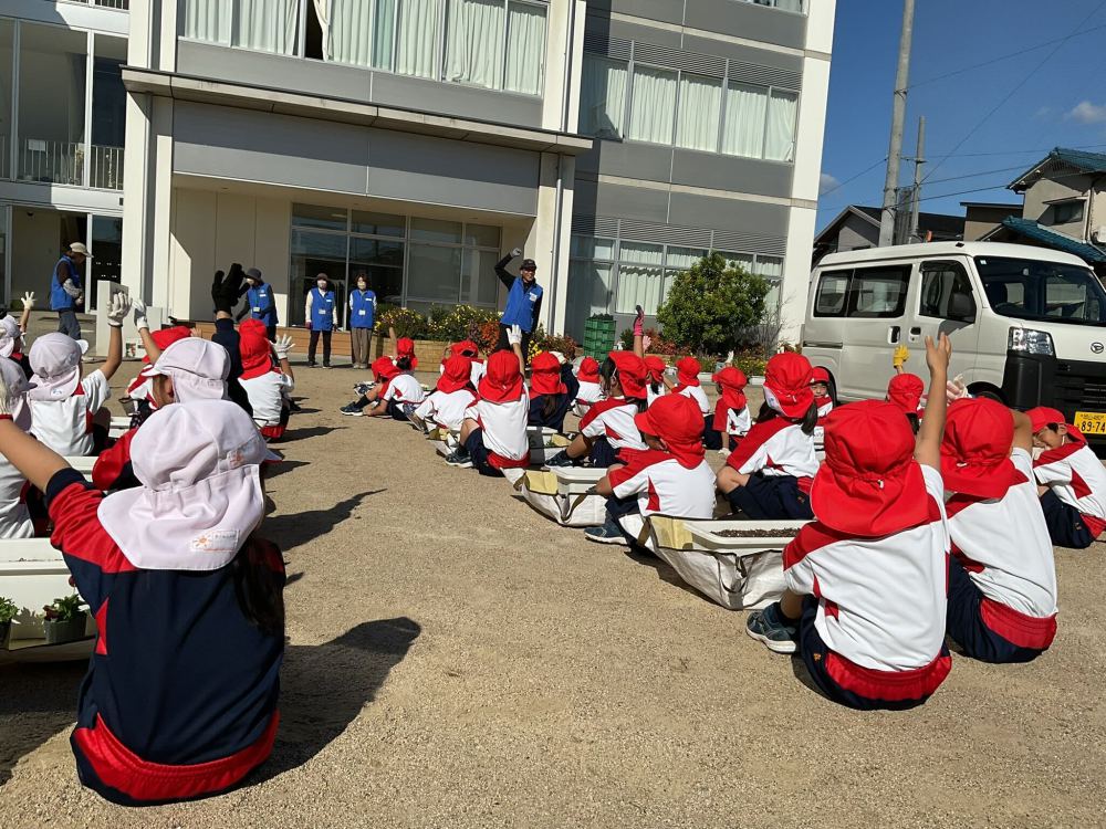 当日は、岡山市公園協会の方がパンジー・ノースポール・ミニハボタンの苗を届けてくださり、子供たちは色や形のちがう花を興味津々に見つめていました。