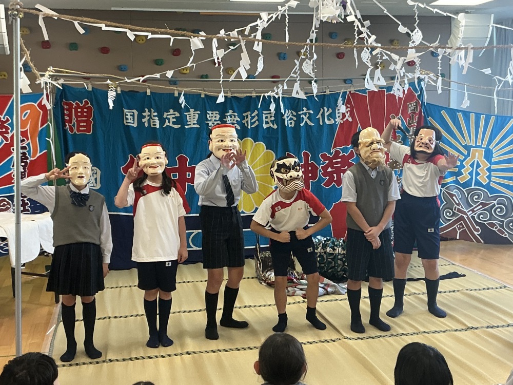 その後は、迫力ある神楽の舞を鑑賞。中でも「大蛇退治」の場面では、太鼓や笛の音とともに繰り広げられる迫真の演技に、子どもたちは目を輝かせて見入っていました。