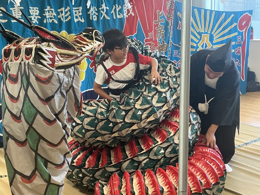 当日は高梁市から3名の先生を講師としてお招きし、備中神楽の歴史や魅力についてお話をうかがったり、実際の舞を見せていただいたりしました。
