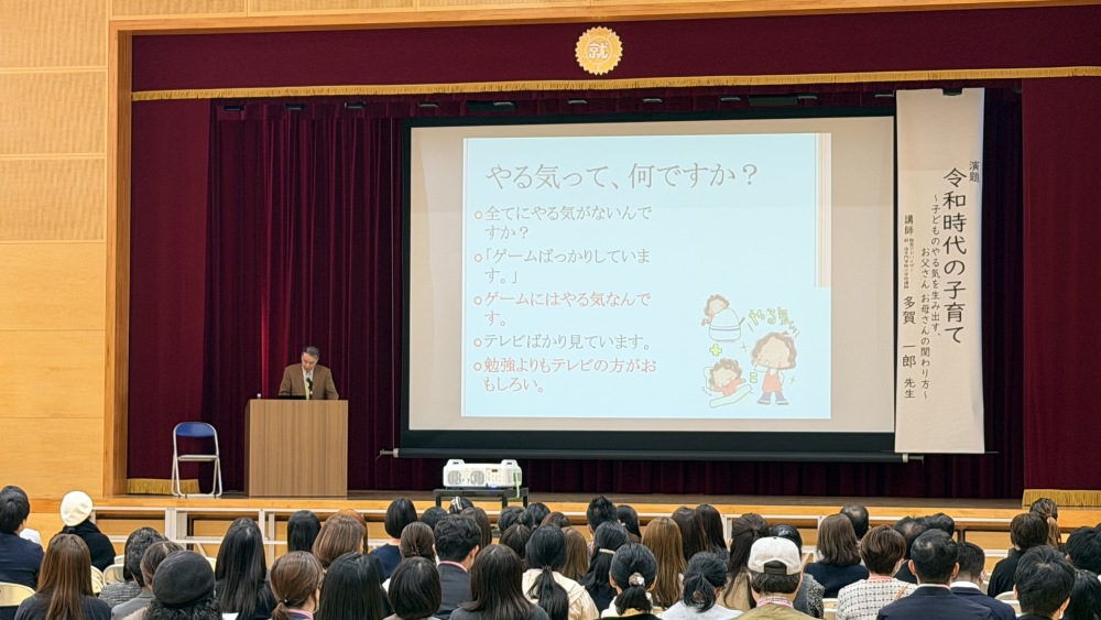 教育講演会は,教育アドバイザーで元追手門学院小学校講師の多賀一郎先生の講演をお聞きいただきました。子育てで誰しもが悩むようなことをエビデンスや具体例を挙げながら,今日からどのように子供に接するかとても参考になるお話をたくさんしていただきました。最後はロバート・マンチ作「ラブ ユー フォーエバー」(岩崎書店)の読み聞かせをしてくださいました。みなさんそれぞれ自分の経験と重なる部分があり,涙があふれる素敵な読み聞かせとなりました。