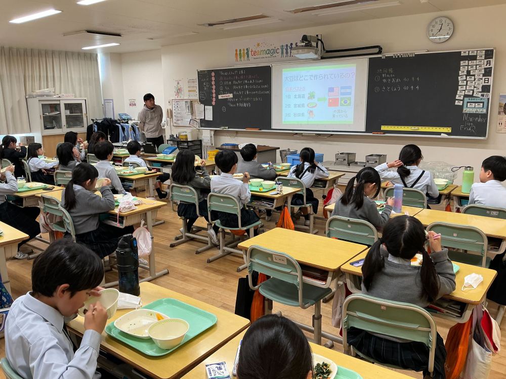 今回は大豆の生産量だけでなく、今回の給食にはみそ汁や醤油を使用したお浸し等、身近にもたくさんの大豆を使用していることなど、詳しく学ぶことができました。
