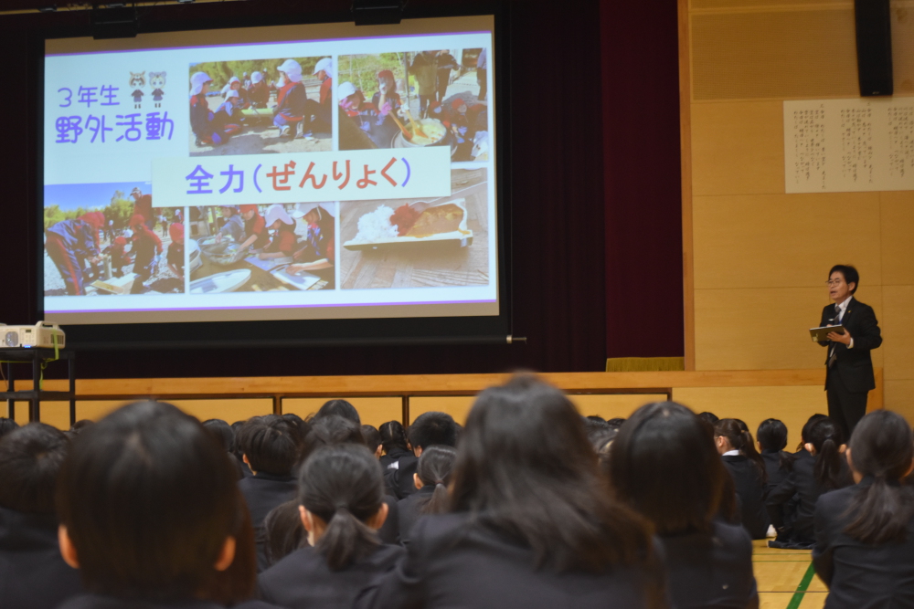 最初に,校長先生からそれぞれの学年の頑張りを表した漢字を紹介しながら,2学期の振り返りのお話がありました。
