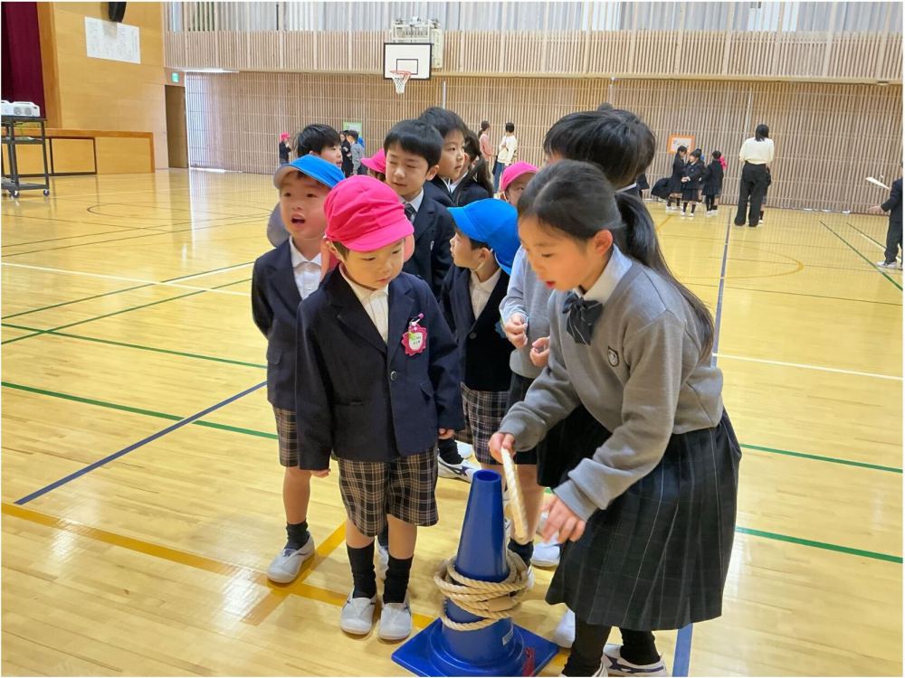 ペアになったこども園のお友達とは,自己紹介をしたり,好きな食べ物の話をしたりしながら,少しずつ心の距離を縮めていきました。「わくわくゲームタイム」では,お手玉や輪投げ,こまなどの遊びを一緒に楽しみ,途中は緊張していた園児も,次第に笑顔が増えていきました。