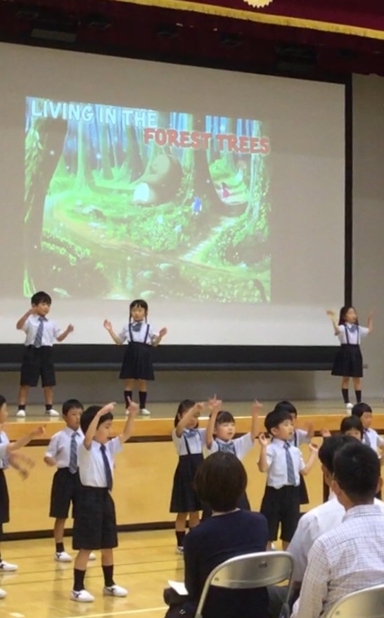 学校説明では、1年生が9月の朝の会で歌っている「となりのトトロ」の歌と踊りを披露しました。また、運営委員会が「就実小学校のよいところ」の発表を、オーストラリア研修に参加した児童の代表がプレゼンテーションを行いました。「どの発表も素晴らしかった」「感動した」などの感想をいただきました。