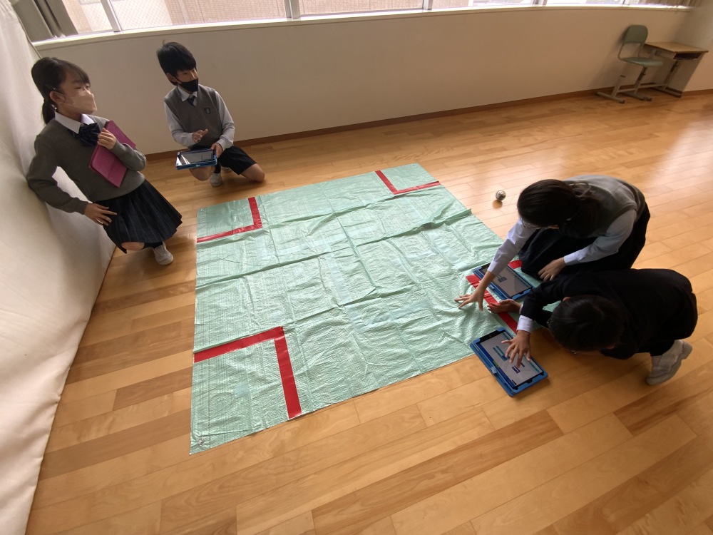 その後、シートの上の四隅を順に回っていくプログラミングをペアで考えて実行しました。