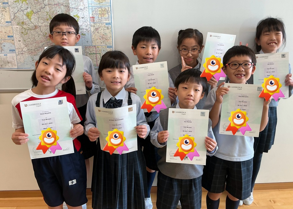 7月15日に本校で行った,Cambridge英検Moversで11シールド以上を獲得した1年生から4年生児童8名を表彰しました。