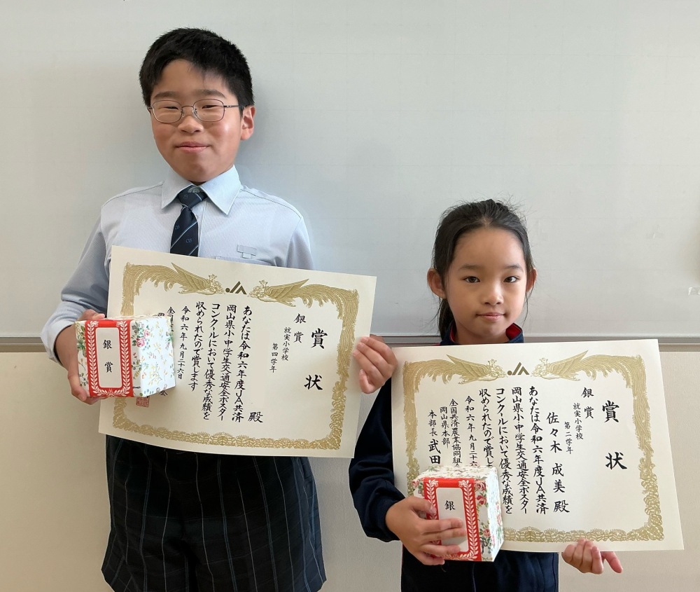 令和6年度JA共済岡山県小・中学生交通安全ポスターコンクールで優秀な成績をおさめた2年生と4年生児童を表彰しました。