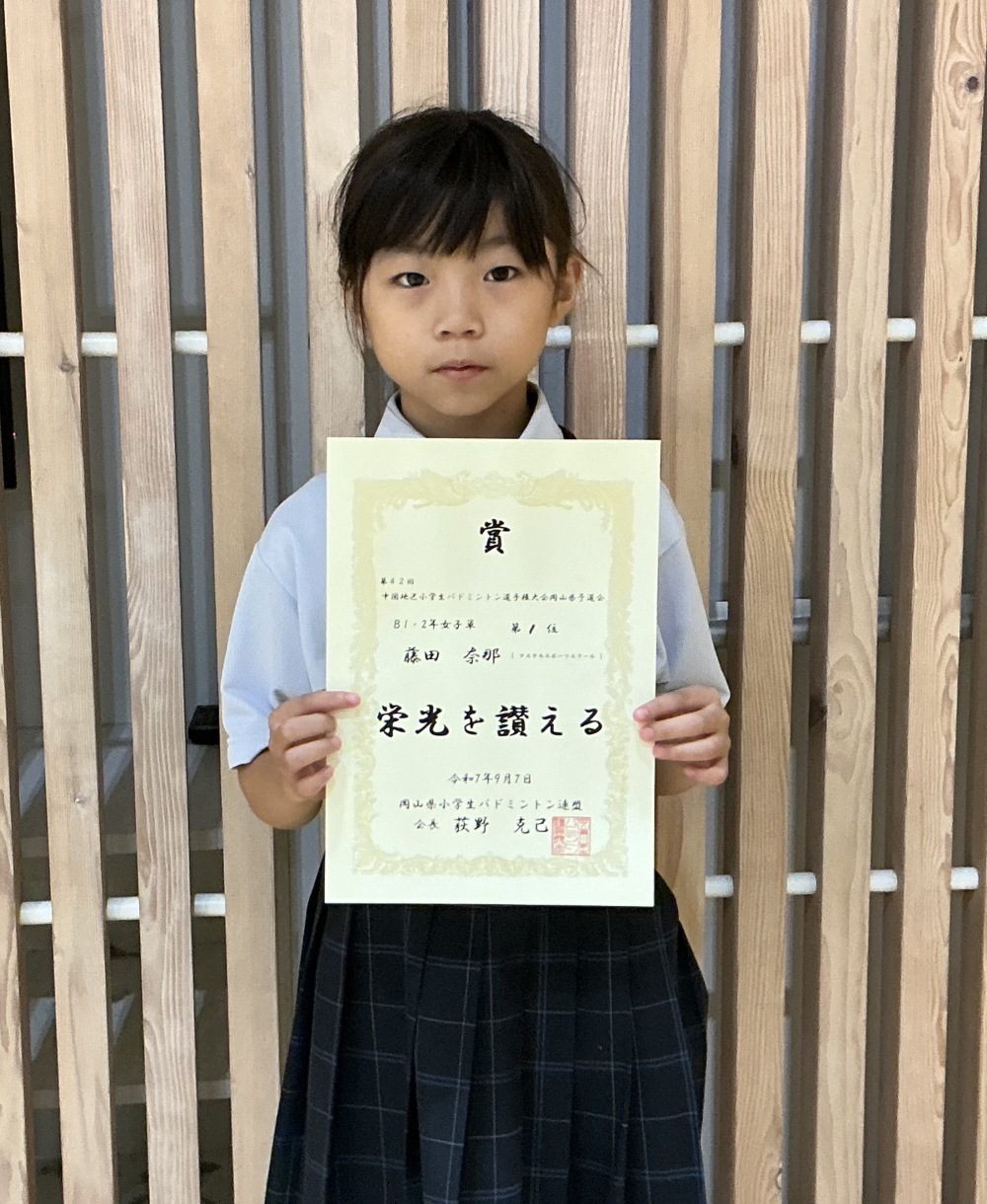 第42回中国地区小学生バドミントン選手権大会岡山県予選会で優秀な成績をおさめた2年生を表彰しました。