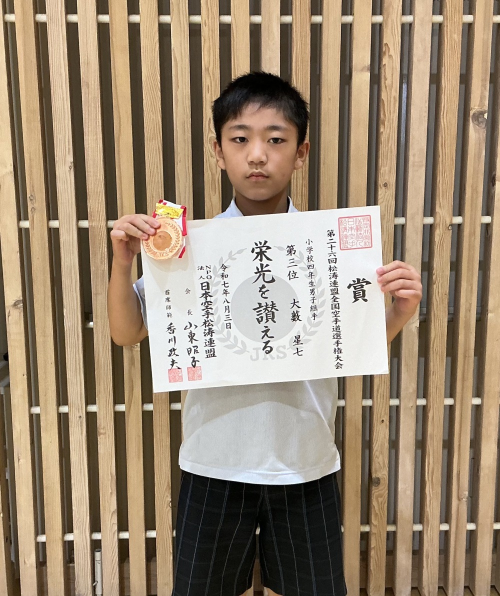 8月に国立代々木競技場第二体育館で実施された本大会において,小学校4年生男子組手の部で第3位に輝きました。