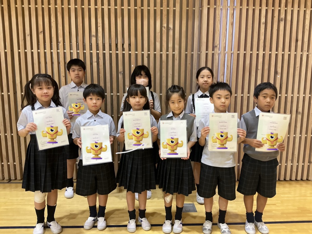 6月12日に,本校で行ったCambridge英検(Movers)で,11シールド以上を獲得した1~5年生9名を表彰しました。