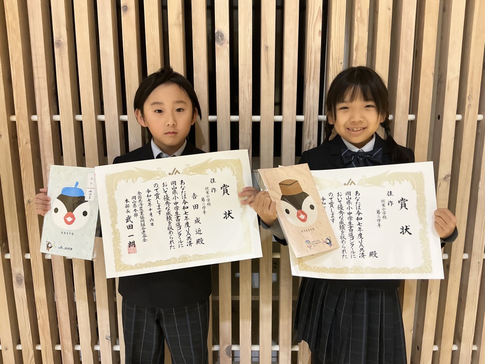令和7年度JA共済岡山県小・中学校書道コンクールで優秀な成績をおさめた2年生と3年生を表彰しました。